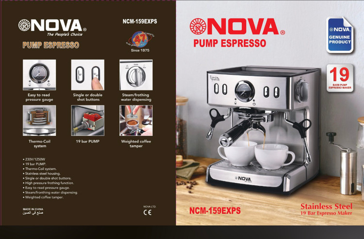 اسپرسو ساز نوا مدل 159 قدرتمندترین اسپرسوساز میان رده در بین محصولات نوا قرار دارد. این دستگاه دارای توان 1350 وات و فشار بخار 20 بار است.